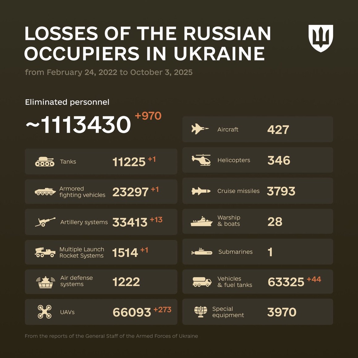 The General Staff of the Armed Forces of Ukraine has published a new summary of total combat losses of the enemy from 24.02.22 to 03.10.25. Find them in the infographics by the Ministry of Defense of Ukraine: