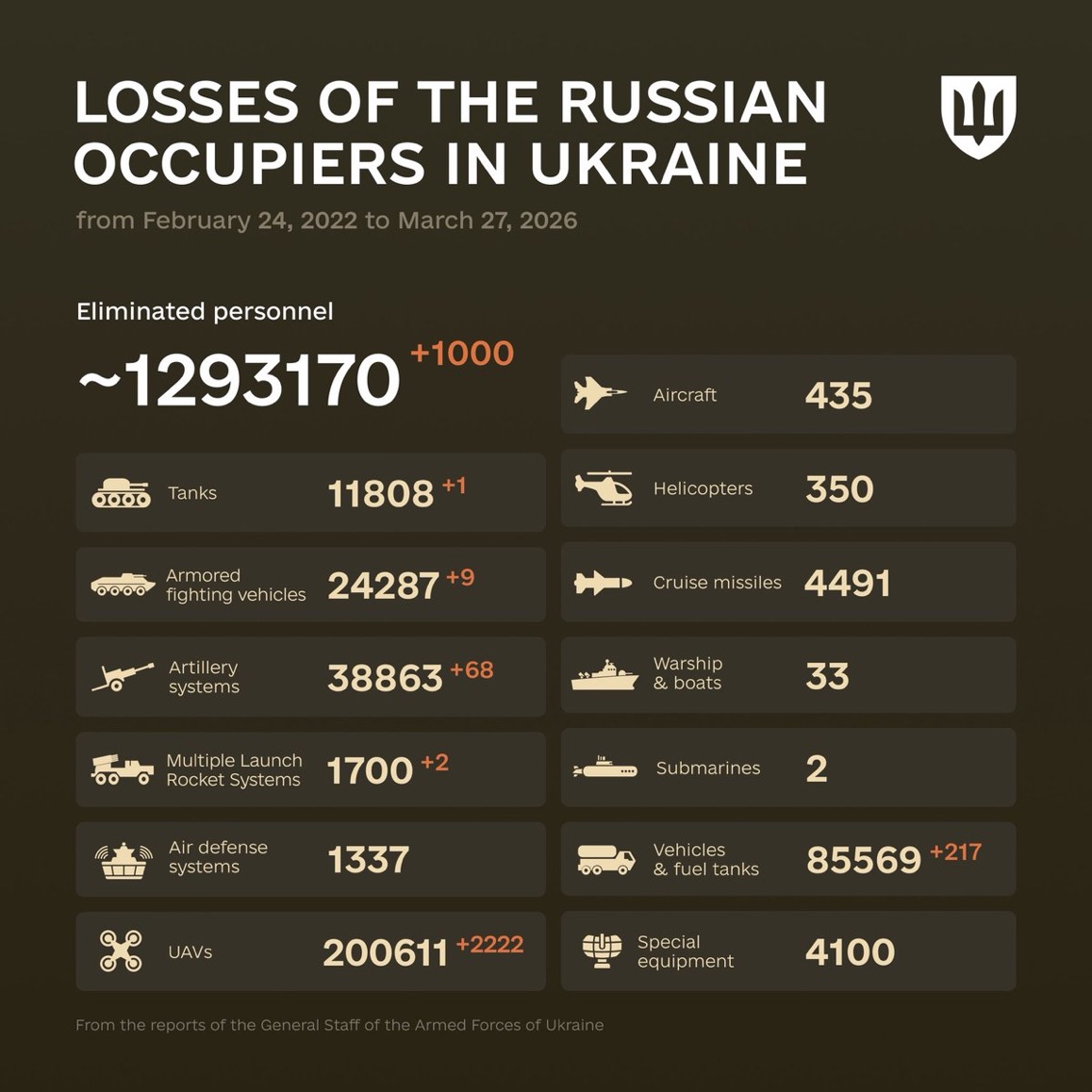 The General Staff of the Armed Forces of Ukraine has published a new summary of total combat losses of the enemy from 24.02.22 to 27.03.26. Find them in the infographics by the Ministry of Defense of Ukraine: