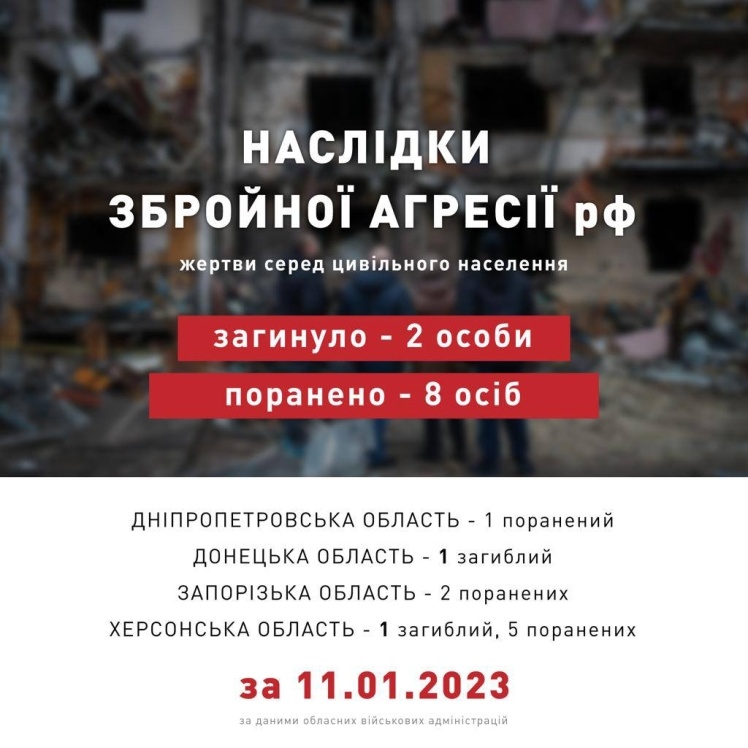 According to him, one person was killed and three were injured in Donetsk region; two people were killed and three were injured in Zaporizhzhia region; one person was injured Kharkiv region; six people were killed and four were injured in Kherson region.