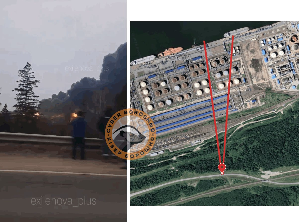 Following the attack, Ukrainian OSINT communities verified imagery showing a large-scale fire at the Ust-Luga oil terminal. The findings were published on March 25 by the CyberBoroshno and Dnipro Osint (Harbuz) projects.