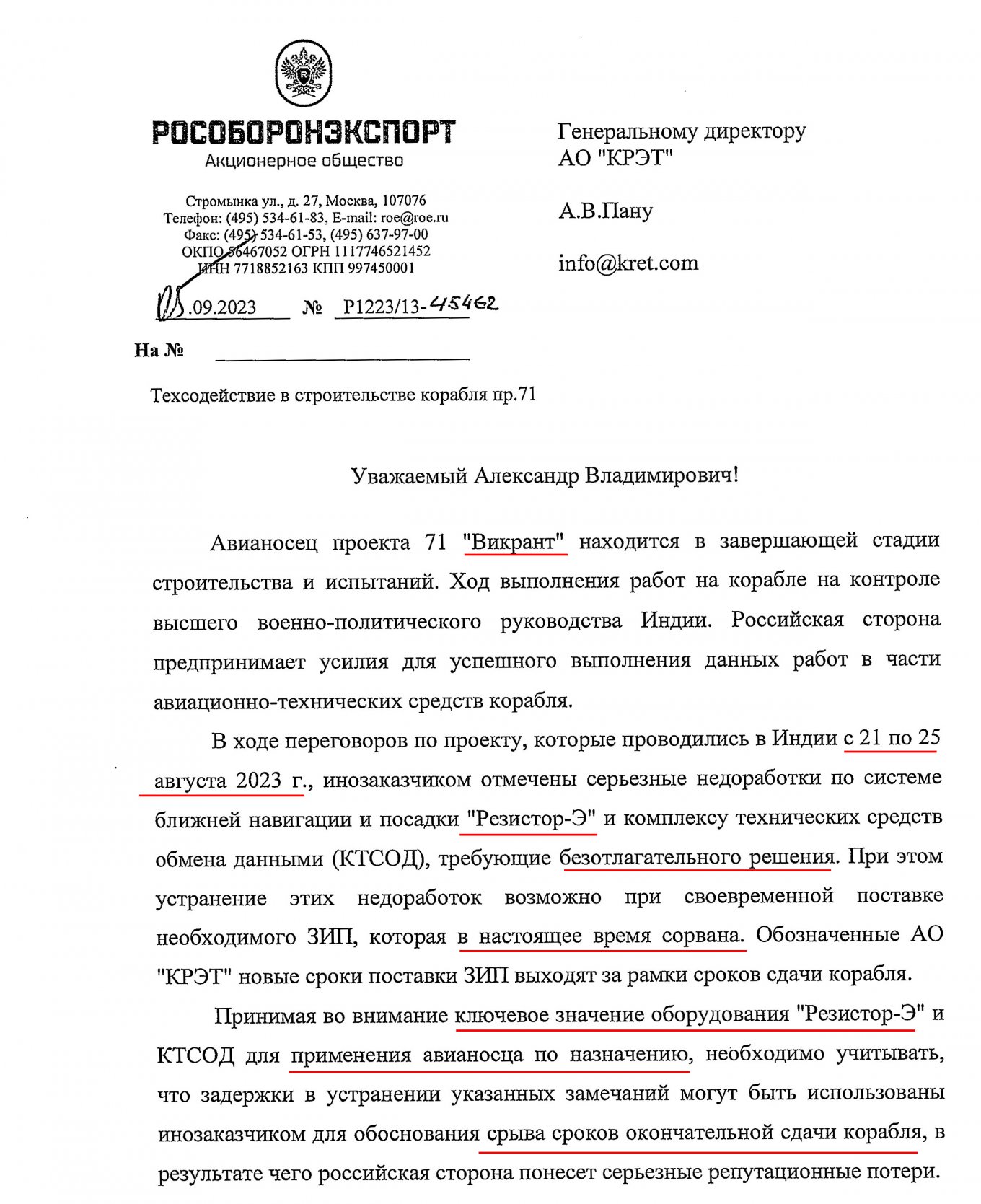 According to a letter dated September 5, 2023, India had found "serious shortcomings in the Resistor-E radar complex and the data exchange technical equipment complex." The letter states that the equipment is "crucial for the aircraft carrier to operate as intended."