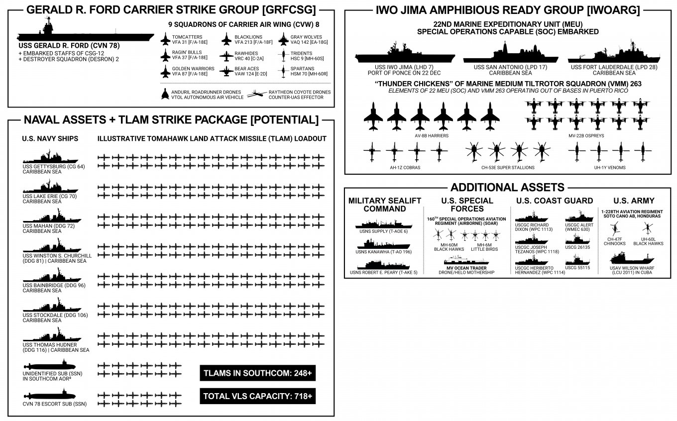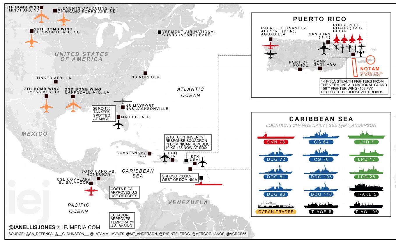 It is also important to outline the known U.S. forces that have been deployed. A preliminary assessment was made by analyst Jan Ellis in late 2025. At the same time, it should be noted that over the course of more than a week, the Pentagon may have concentrated additional forces, especially given the relatively short distance from the continental United States.