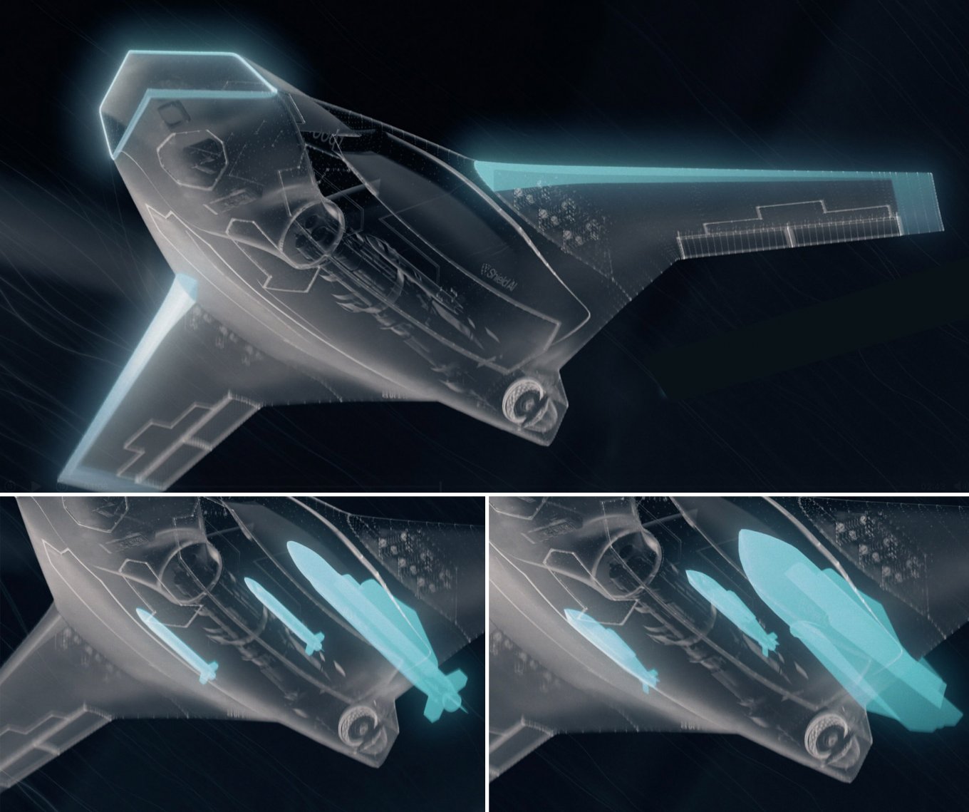 Armament options are substantial: the X-Bat can carry two AIM-120 air-to-air missiles or two bombs in internal bays, and it is also rated for external payloads such as cruise missiles.